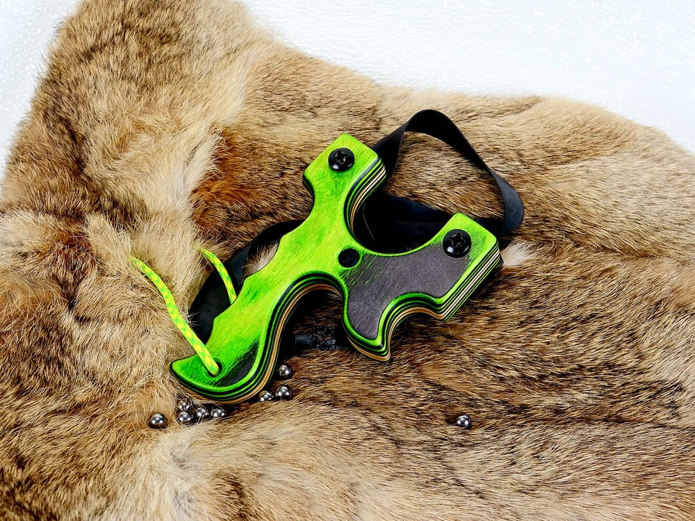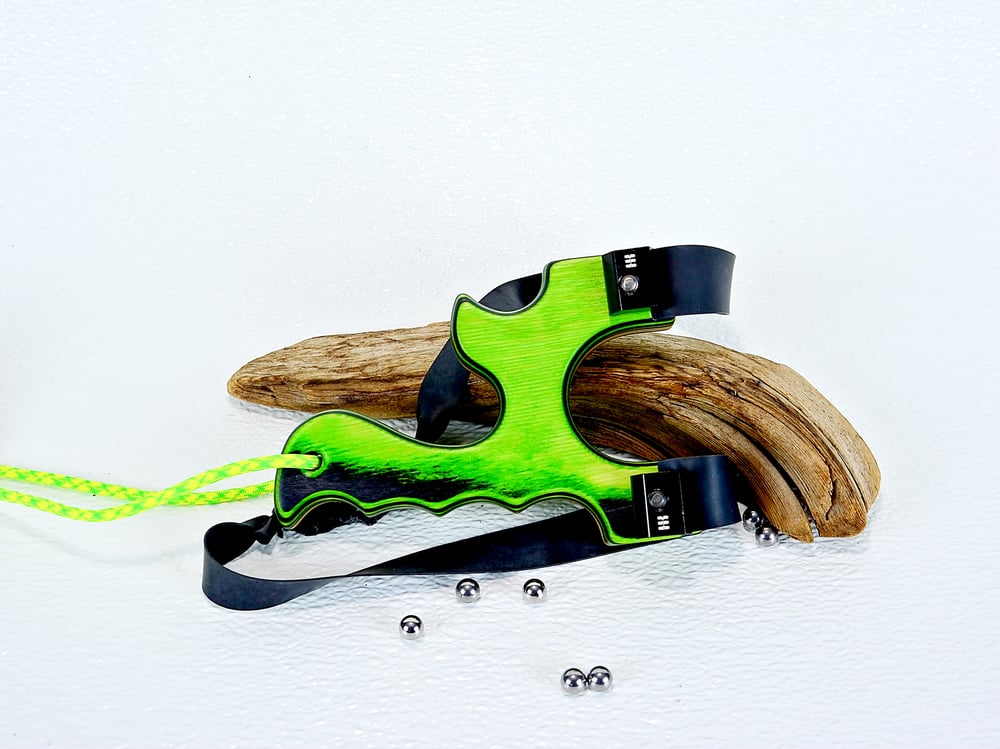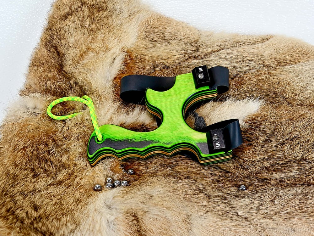 This handmade wooden slingshot is made out of Spectraply Wood called Green Hornet. This is made to shoot OTF for right handers (left hand hold).