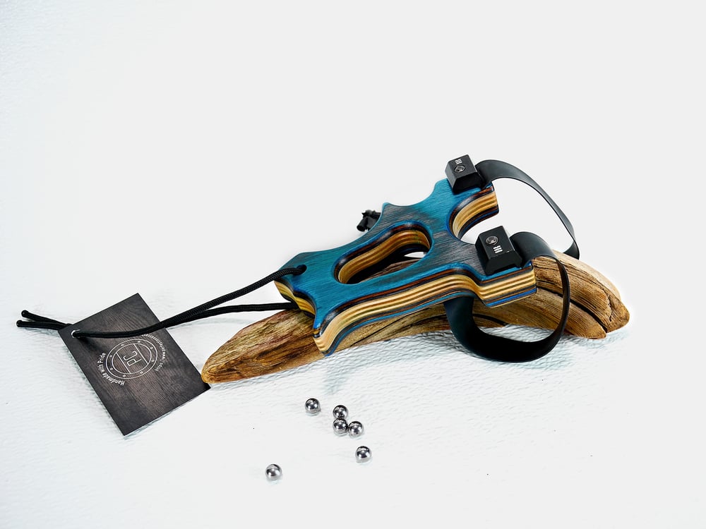 This compact wooden slingshot is made out of wood called Dark Aqua Spectraply. We added a Birchwood Plywood inner panel to add strength and durability. This is made to shoot OTF (over-the-fork). This is for right handers (left hand hold). This comes with a band and pouch, and don't forget that free ammo comes with as well! Everything ready to get you shooting right out of the box!
