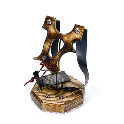 SLING SHOT DIPLAY STAND (optional accessory in drop down and priced at $5 less then buying it separately). Our Sling Shot stand is made out of Ash and is adorned with silver steel ball bearings that add a nice decorative touch to the stand. The metal has been blued and then fitted with shrink tubbing on the metal bars so to protect the sling shot as it rest against the frame. This makes for a great accessory to that sling shot lover to display their favorite shooter!