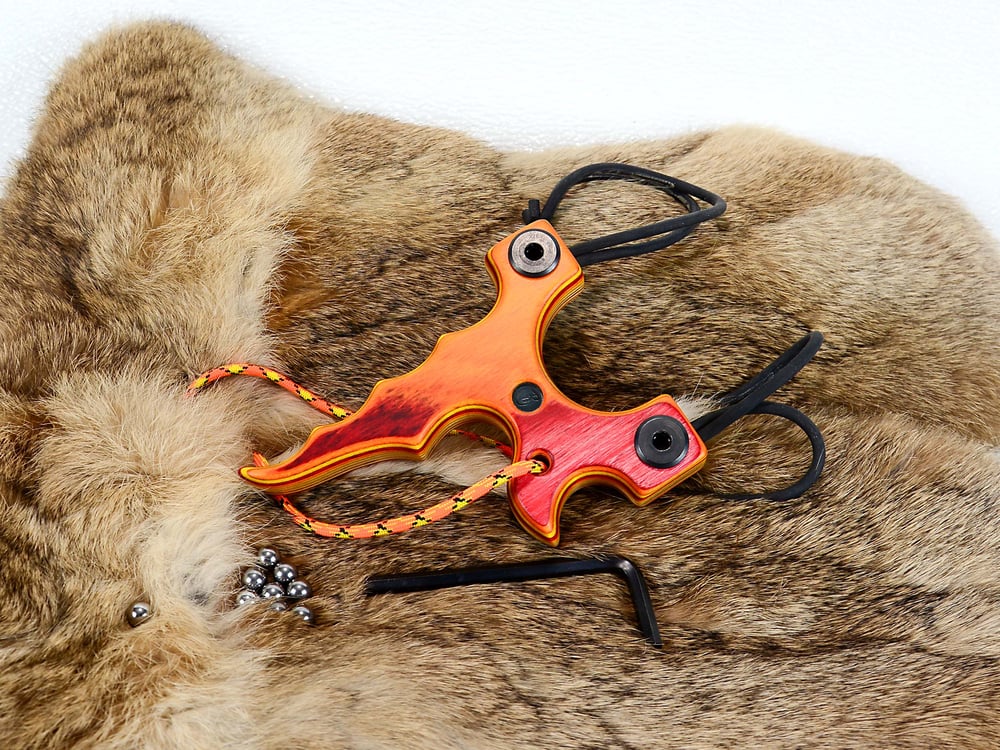 This handmade wooden slingshot is made out of Spectraply Wood called Tequila Sunrise! We added a Birchwood Plywood inner panel to add strength and durability. This is made to shoot OTF and for right handers (left hand hold). This slingshot is designed for a round tube band and pouch. We included the Allen wrenches for easy change out of the round tube bands.