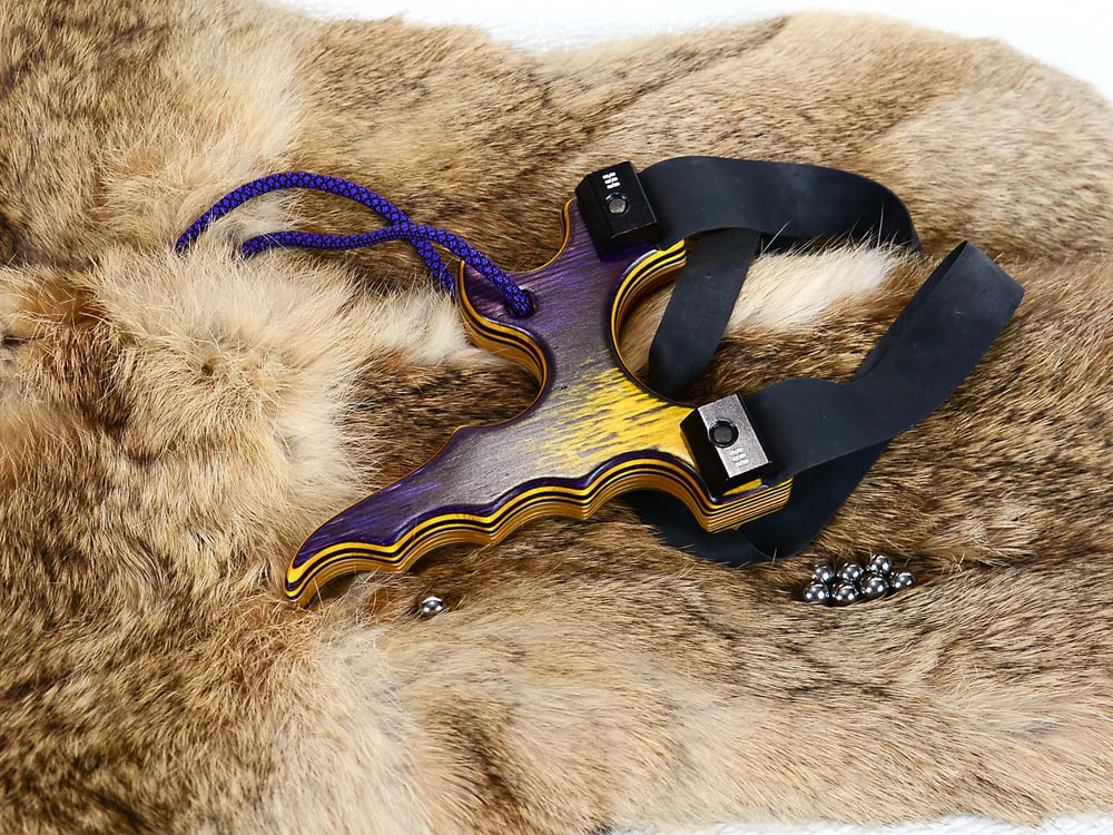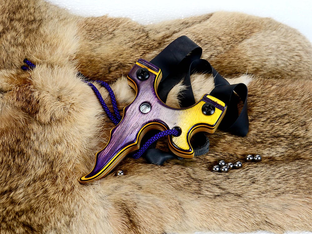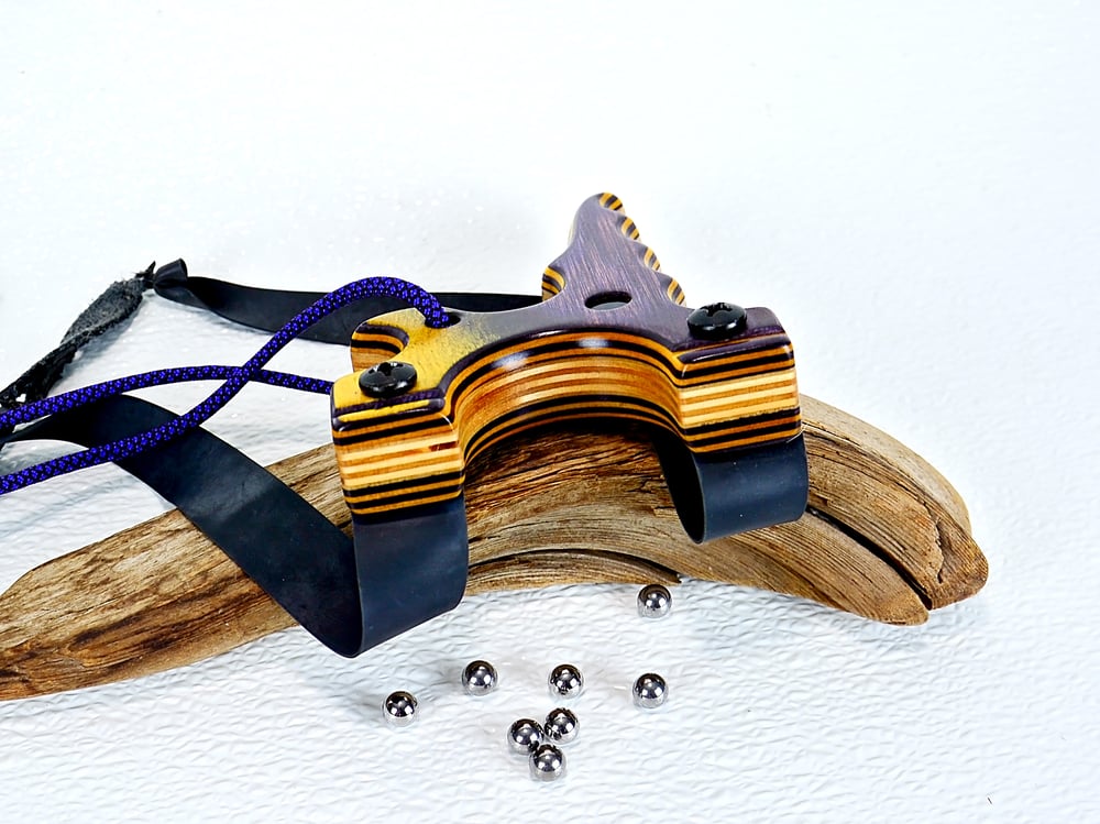 This handmade wooden slingshot is made out of Spectraply Wood called Yellow Jacket! This is made to shoot OTF and for right handers or left handers - simple flip the flip clips around!