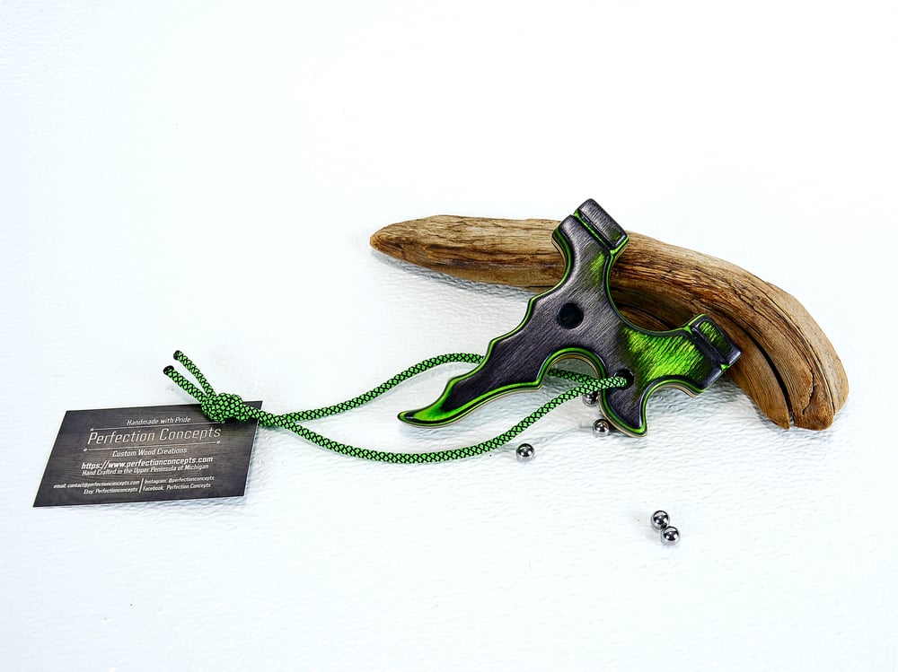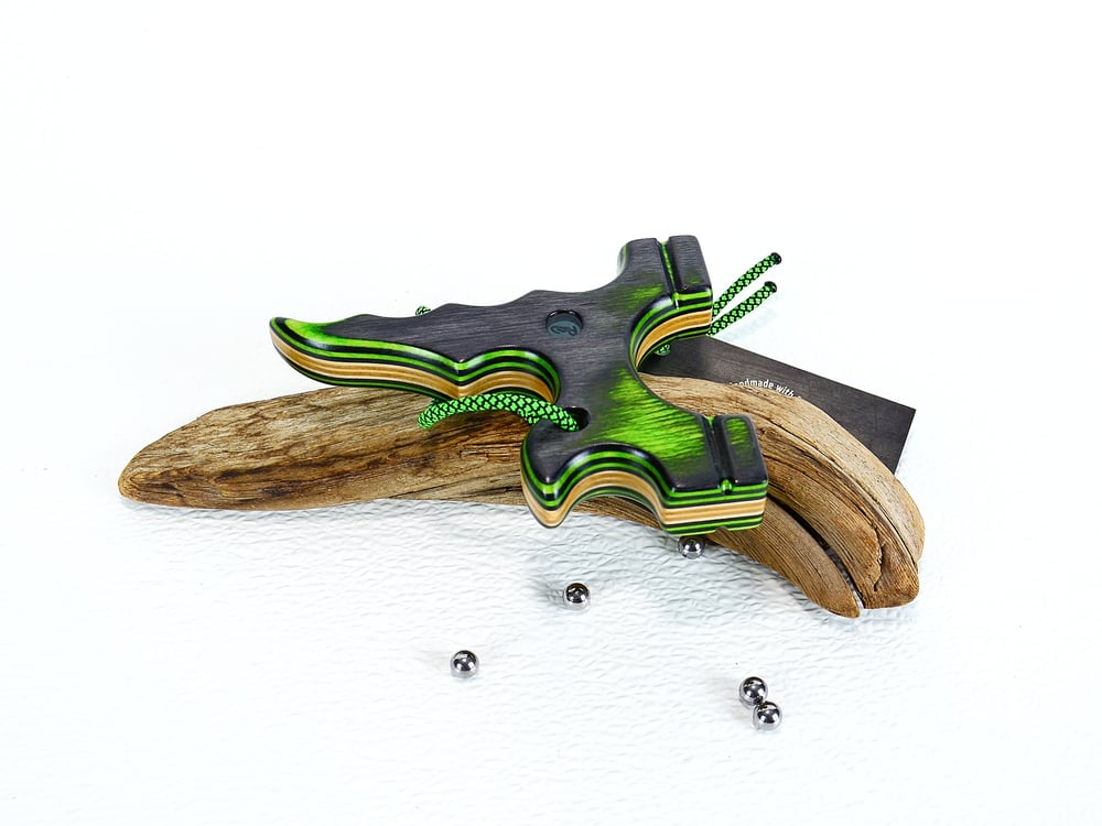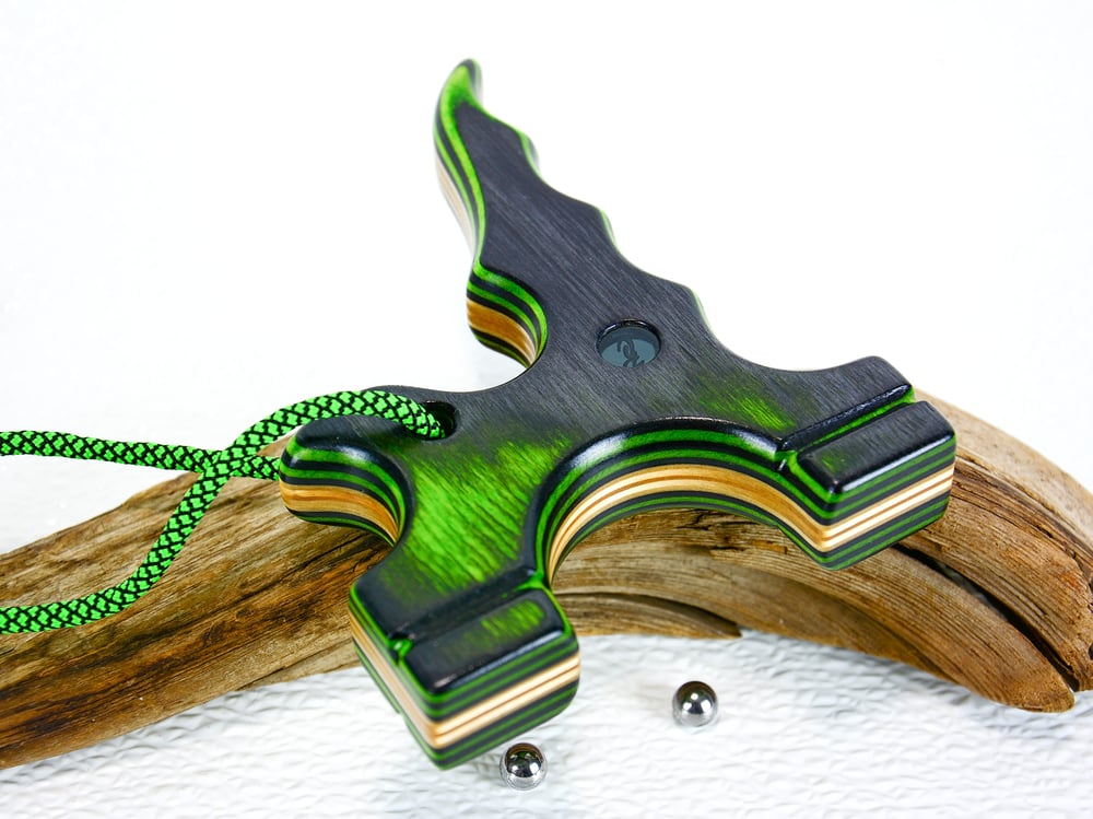 The contrast of colors on this slingshot is amazing between the Neon Green and the charcole gray. Then you look at the side and see all the variation of colors! We used a wood called Spectraply Green Hornet and placed a high quality birchwood in the center, cross grain, to add strength and durability. This will be an awesome shooter with years of life!