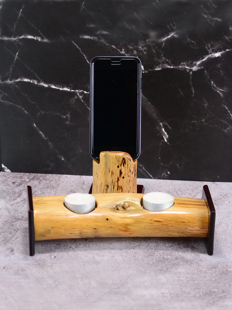 This is a matching set of a cell phone holder and a tea light candle. This Wood Votive Tea Light Candle Holder is made with Maple and accented with Red Dymalux wood called Apple Jack. This will hold two (2) tea light candles. Tea Lights included.